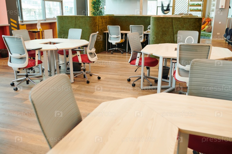 Интерьер большого офиса на открытом пространстве со многими стульями рядом с разными видами столов