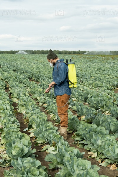 Боковой вид молодого фермера, распыляющего пестициды на капусту