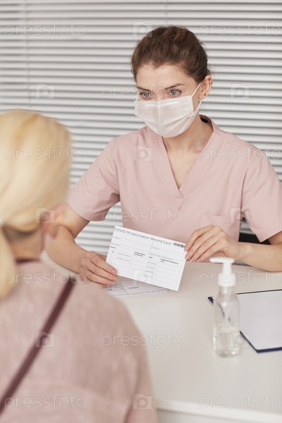Женщина-врач дает карту вакцинации пациенту