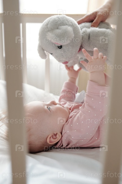 Милая девочка, играющая в серые мягкие игрушки