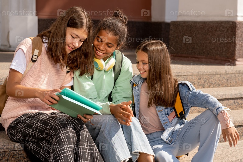 Три милые школьницы смотрят на страницу открытого копийника