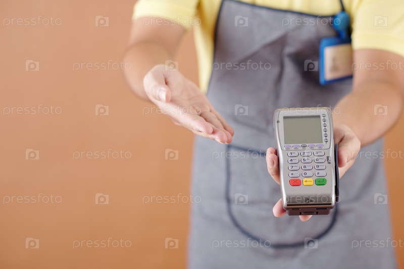 Руки официанта, предлагающего платежный терминал клиенту, оплачивающему обед в кафе