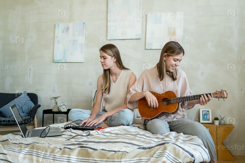 Милая девочка-подросток записывает музыку своей сестры-близнеца, играющей на гитаре