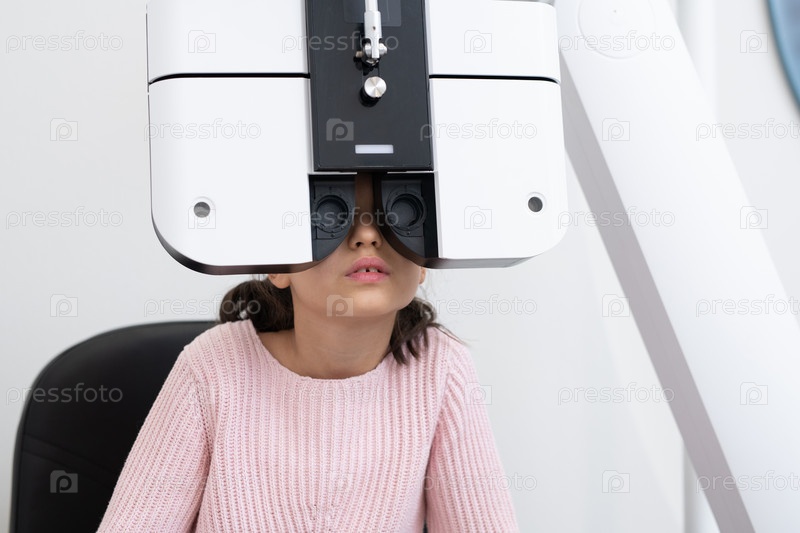 Милая ученица начальной школы, сидящая перед офтальмологическим оборудованием