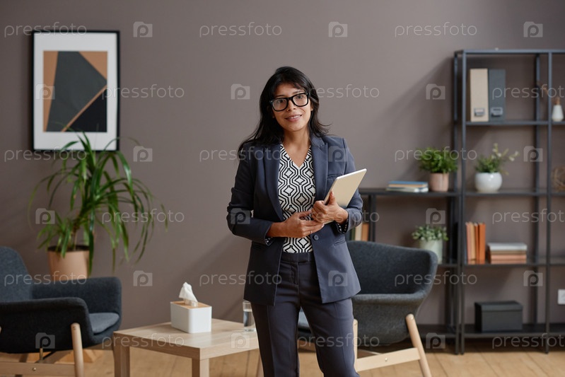 Горизонтальный средне-длинный портрет современной профессиональной психотерапевтки в очках, которая держит цифровой планшет и стоит в своем офисе, глядя на камеру