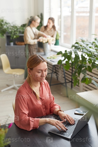 Успешная деловая женщина использует ноутбук в цветочном магазине