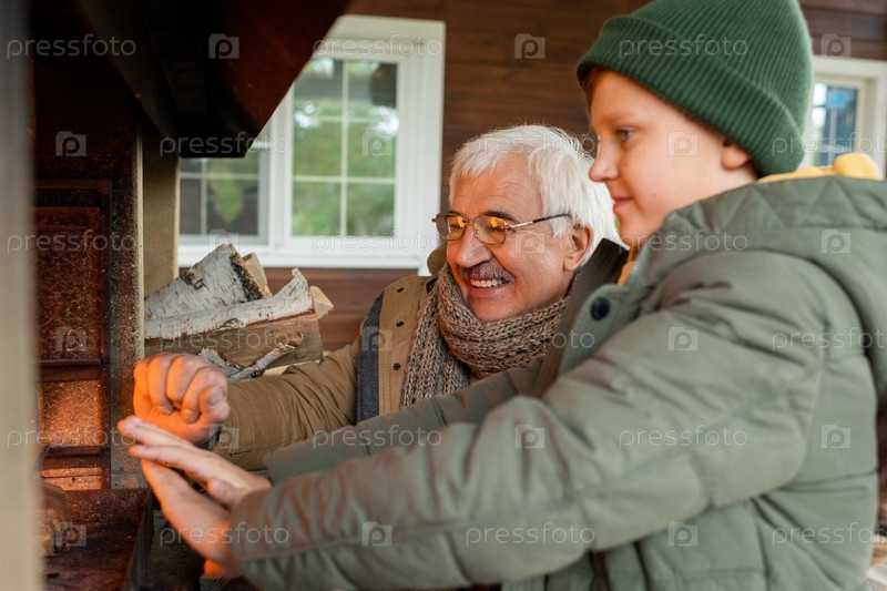 Счастливый старший мужчина и его внук стоят у камина с горящими дровами