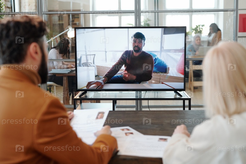 Два работодателя задают вопросы мужчине во время онлайн-интервью