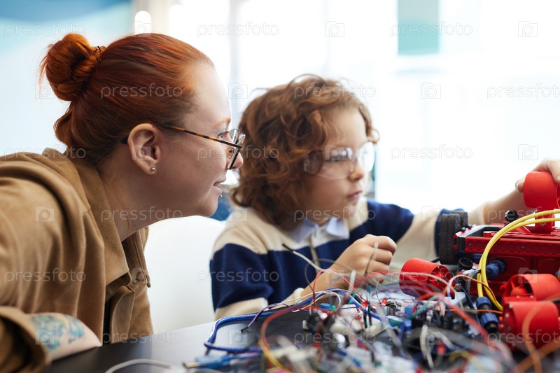 Милый мальчик в мастерской робототехники