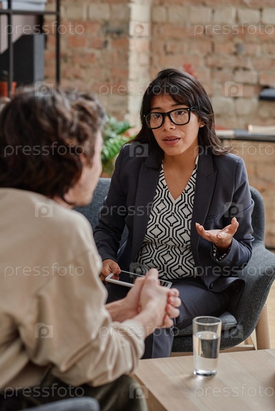 Вертикальный средний снимок неузнаваемого молодого человека, лечащего депрессию с помощью профессионального психотерапевта, слушающего ее предложения