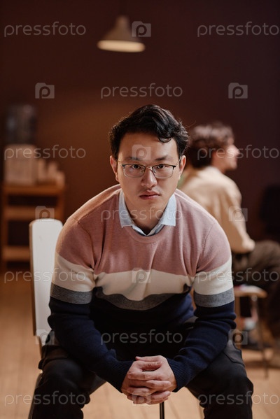 Вертикальный средний портрет молодого взрослого азиатского мужчины, принимающего участие в групповой терапии, сидящего на стуле и смотрящего на камеру