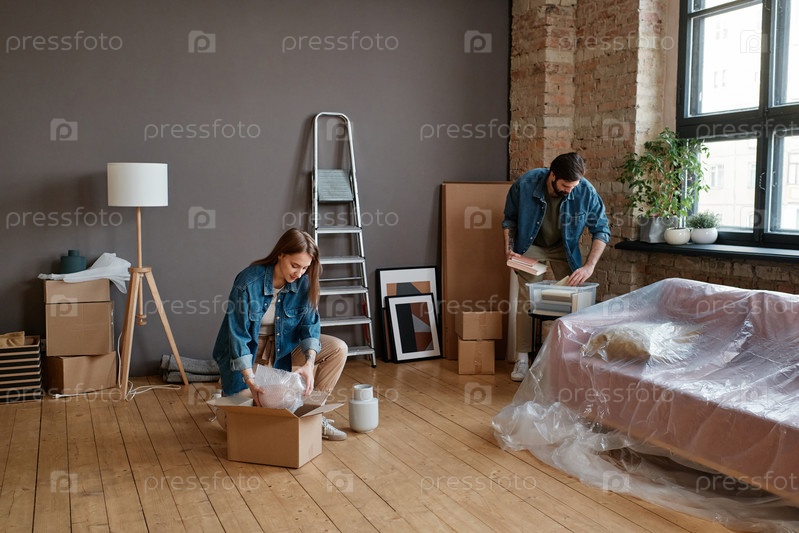 Горизонтальный длинный снимок молодого человека и женщины, переезжающих в новую квартиру и распаковывающих коробки