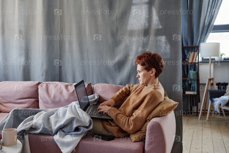 Горизонтальный боковой снимок зрелой женщины с гриппом, сидящей дома и работающей на ноутбуке