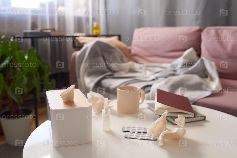 Горизонтальный безлюдный выстрел бумажных салфеток, таблеток, медикаментов, чашки чая и книги на столе в гостиной
