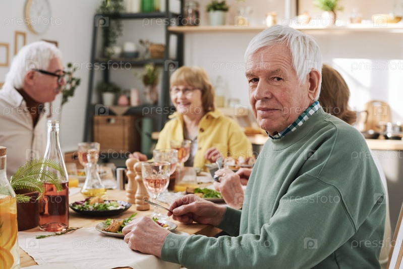 Старший мужчина ужинает с друзьями