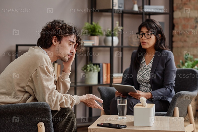Горизонтальный средний снимок грустного молодого человека, лечащего депрессию с помощью профессионального психотерапевта