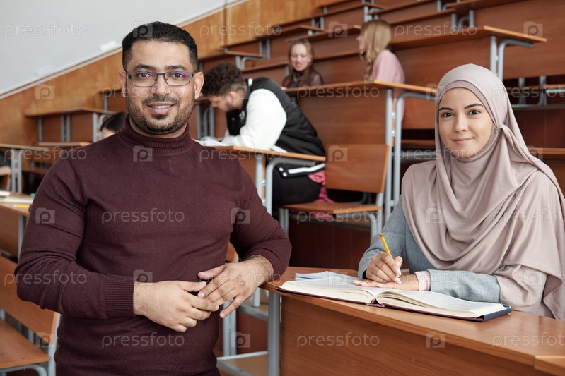 Успешный учитель-мужчина стоит у стола, где студентка в хиджабе сидит и делает заметки