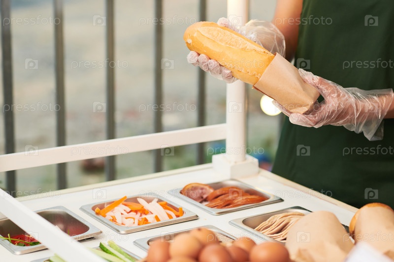Продавец ставит бутерброд в картонную упаковку