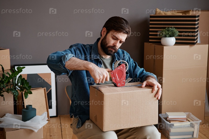 Горизонтальный средний кадр молодого человека, сидящего на стуле и готовящегося к переезду в новый дом, упаковывающий вещи в коробки и записывая их