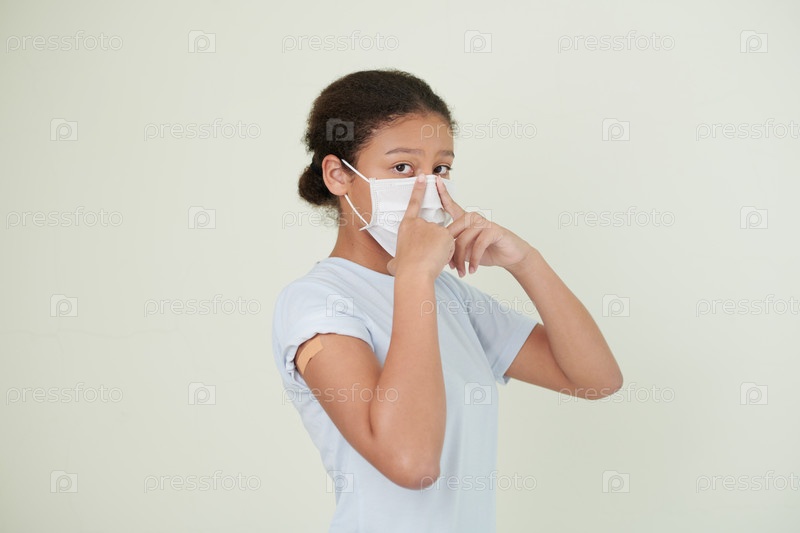 Девушка-подросток надевает медицинскую маску