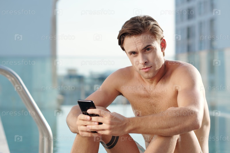 Красивый мужчина сидит у бассейна