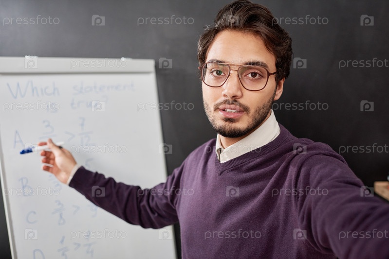 Сельфи уверенного молодого учителя смешанной расы в очках и фиолетовом свитере, указывающего на доску