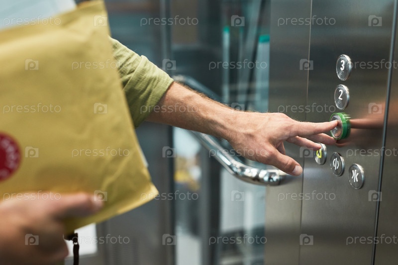 Парень-доставщик в лифте Close Up