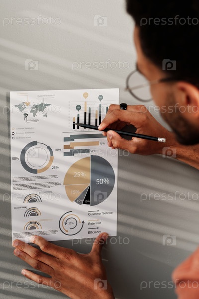 Вид сверху плеча специалиста по маркетингу, рисующего карандашом на графике во время работы со статистикой