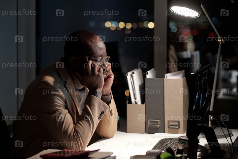 Сонный африканский бизнесмен прикасается к лицу, сидя перед компьютером