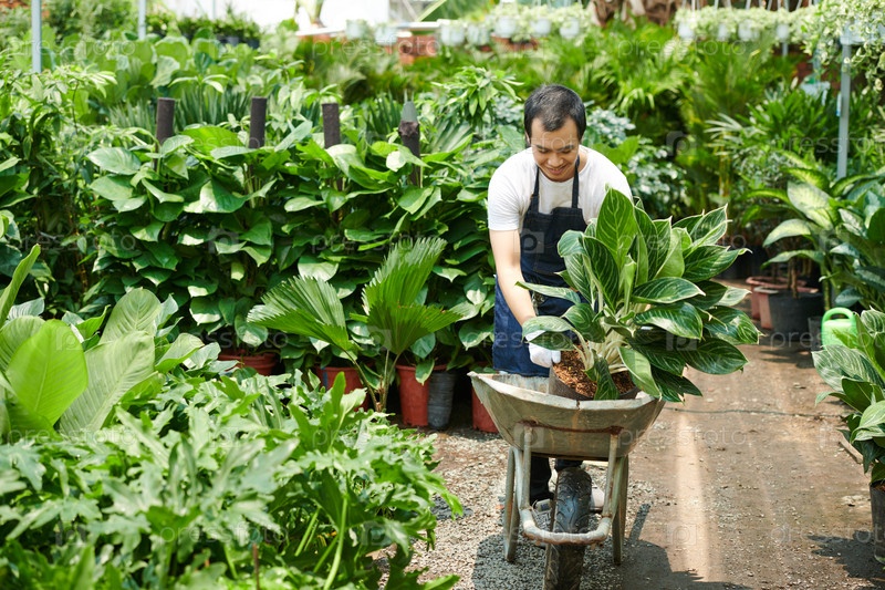 Человек кладет растения в коляску