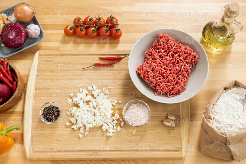 Площадь свежих овощей и фаршированного мяса на деревянном кухонном столе