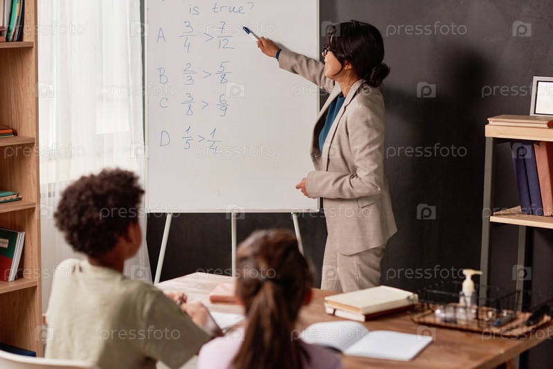 Испаноязычный учитель с волосками, указывающий на доску во время работы с детьми в классе