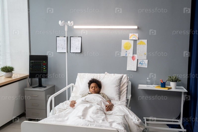 Маленький мальчик лежит в больничном отделении