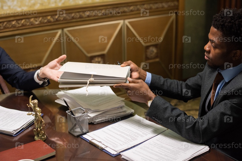 Молодой адвокат-мужчина передает папку с документами коллеге