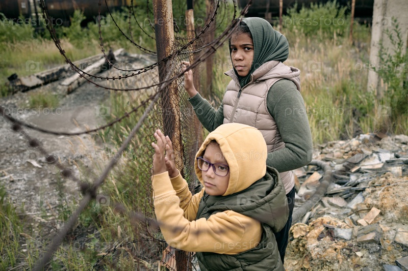 Две маленькие девочки в толстовках и куртках стоят у сетки, разделяющей лагерь беженцев