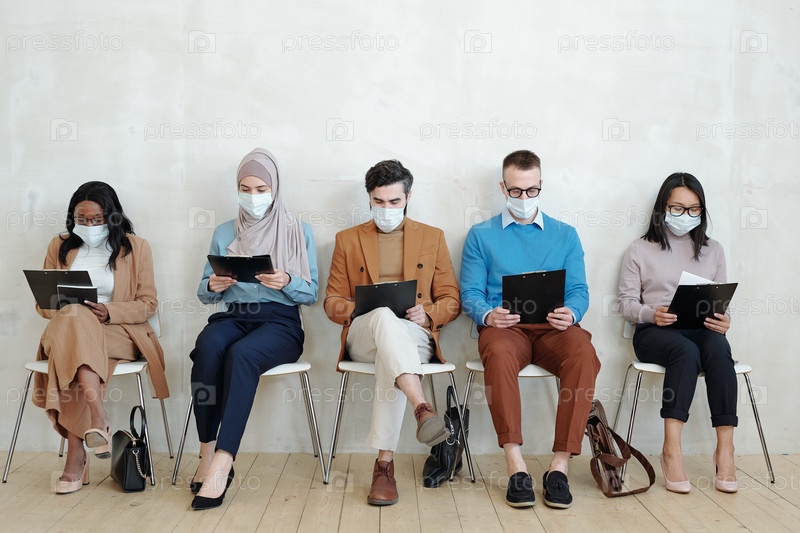 Молодые специалисты по защитным маскам просматривают свое резюме