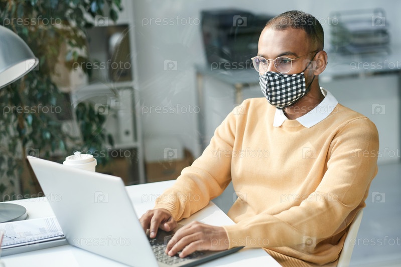 Концентрированный молодой мультиэтнический управляющий счетами в маске для лица и очках, используя ноутбук при анализе интернет-исследований