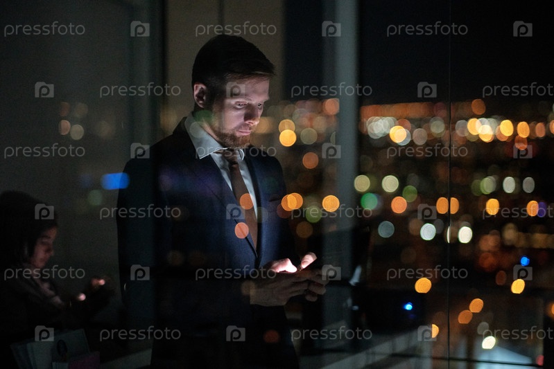 Молодой серьезный бизнесмен прокручивает свой смартфон у окна