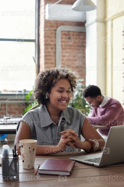 Счастливая молодая бизнесвумен с наушниками смотрит онлайн-видео