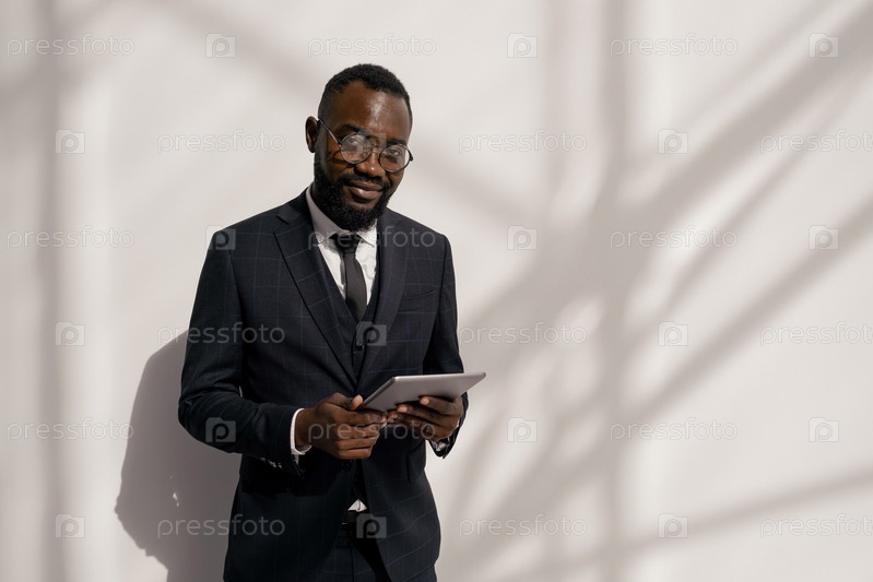 Счастливый молодой африканский менеджер в костюме прокручивает планшет