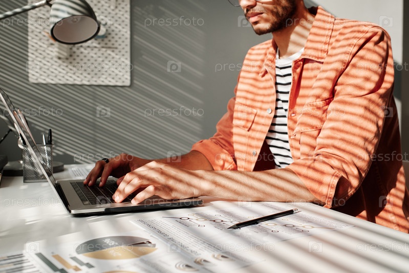 Близкий план серьезного занятого молодого чернокожего менеджера в коралловой рубашке, использующего ноутбук во время работы с онлайн-данными