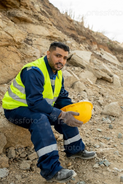 Молодой строитель смешанной расы сидит на стройплощадке и отдыхает