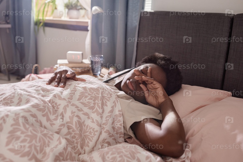 Уставшая женщина, лежащая на кровати