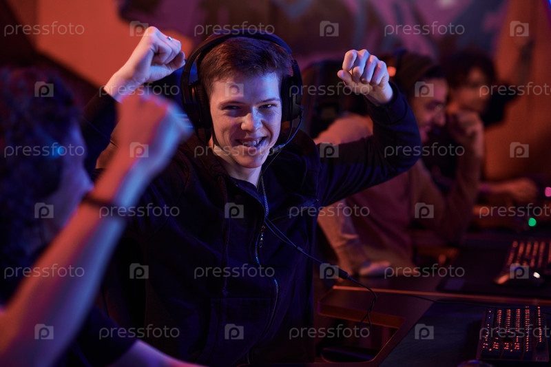 Веселые игроки киберспорта празднуют победу