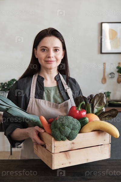 Привлекательная женщина держит коробку, полную полезных продуктов