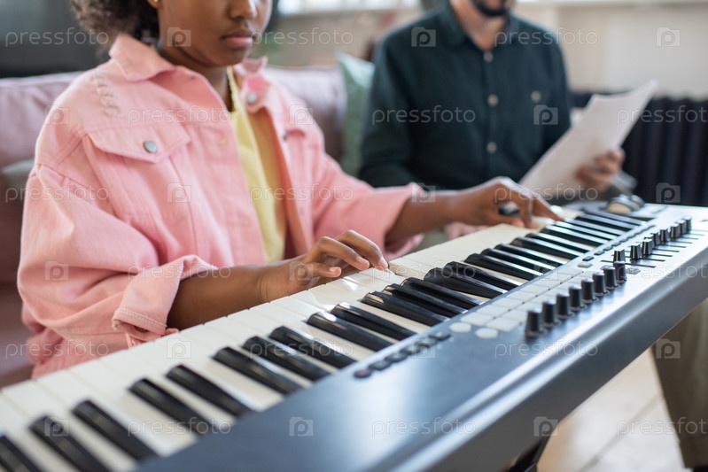 Руки бирациальной усердной школьницы, играющей на пианино клавиатура