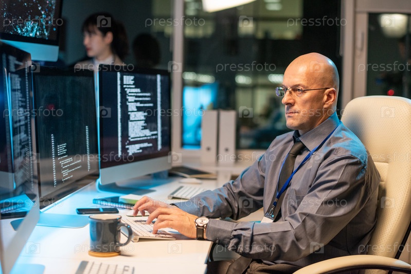 Серьезный лысый бизнесмен просматривает данные на экране компьютера