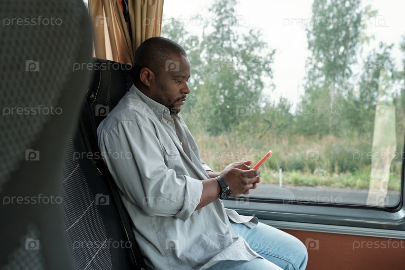 Боковой вид молодого африканского человека со смартфоном, сидящего у окна