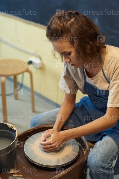 Молодая креативная женщина сидит у вращающегося керамического колеса