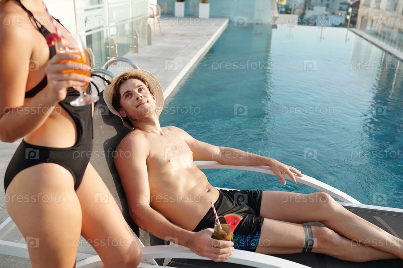 Мужчина смотрит на красивую девушку с коктейлем